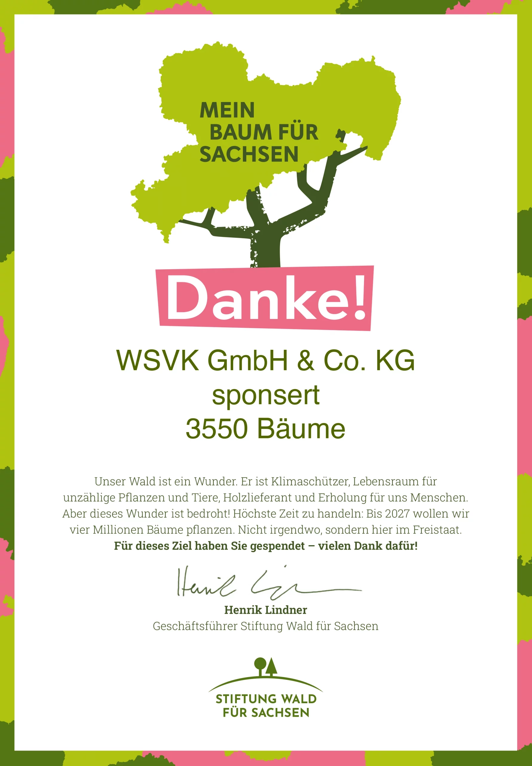 Seit unserer Gründung setzen wir auf nachhaltiges Handeln – und das mit Erfolg. Gemeinsam mit unserem Partner „Wald für Sachsen“ leisten wir seit 2023 einen wertvollen Beitrag zum Umweltschutz. In eigener Handarbeit haben wir bereits 2400 Bäume in unseren regionalen Wäldern gepflanzt. Jeden Tag wächst unser Engagement weiter und zeigt, dass selbst kleine Taten Großes bewirken können.